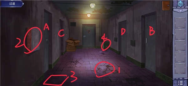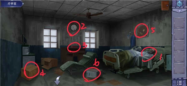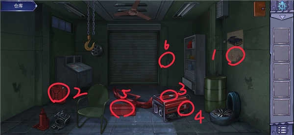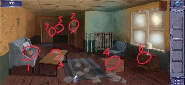 差不多每个场景都会把道具和谜题重置,跨场景的谜题很少见。场景的首图会用红圈把可互动的物品圈出来并标上编号——前几个场景的编号有些混乱,后面就基本按操作顺序来编了。
