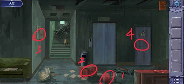 3、点击4,打开电源后点击1以获取线索,将数字进行反向对称处理,仅观察左半边即可得到密码4715。
