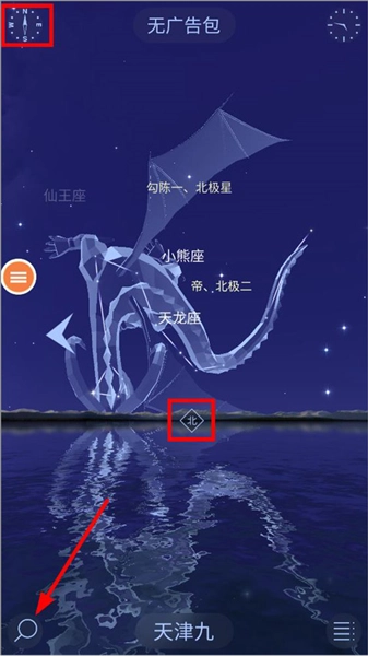 1、启动星空漫步2应用,进入主界面后,屏幕会展示当前位置对应的星座。在界面左上角,根据提示找到指南针方向的标识,随后点击左下角的搜索按钮。