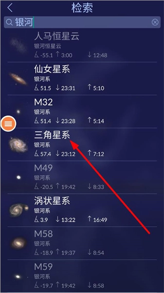 2、在搜索框输入“银河”并点击搜索,即可找到银河系相关的星云、星系等内容,随后点击银河系中的任意一个星系即可。