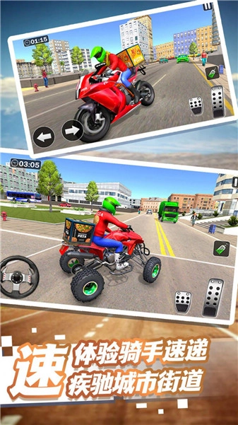 《疾速城市飞驰外卖》是一款真实模拟类的外卖员扮演游戏,玩家可以在这里体验丰富多样的任务,驾驶各类交通工具完成外卖配送,还能参与诸多有趣的互动玩法,在一次次任务挑战中收获独特的趣味体验。