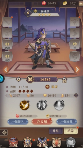 武将可通过招贤馆抽取获取,若重复获得同一武将,将自动转化为武将碎片;当碎片数量积累到一定程度,就能为武将升星。升星后的武将不仅战力会显著提升,其兵力、军心、统率和军略这四项属性也会同步增强,同时技能等级与威力也会得到提升,这是提升战力的主要方式。此外,武将碎片还可从剧情副本、事件“名仕寻访”中获取,偶尔参与活动也有机会获得。