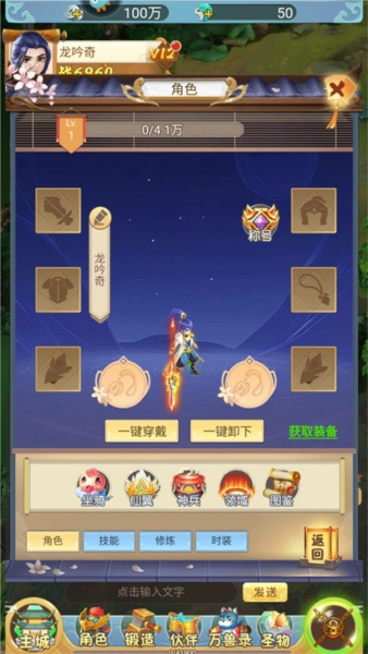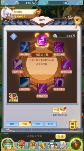5、进入角色界面后,还能学习技能,点击“一键升级”按钮就能快速提升,大幅增强战斗力;