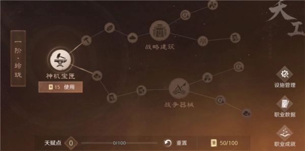 职业技能的升级依赖天赋点,释放职业技能则需要消耗策书。当天赋升级后,职业技能所需的策书数量会相应减少,例如天工天赋升级后,神机宝匣这一职业技能的策书消耗就会从15点下降至5点。