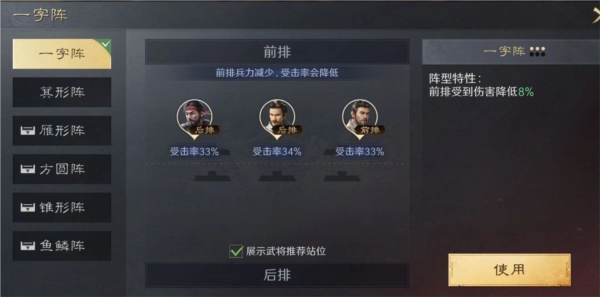 1.武将站位与阵型:在三谋游戏里,武将的站位是由所选阵型来决定的。一字阵的特点是三名武将呈一字形排开,不存在前后之分。对于新玩家,建议点击“展示武将推荐站位”的选项,这样就能了解自己拥有的武将适合放在哪个位置。通常情况下,站在前排的武将被敌人普攻和技能命中的概率是最高的。