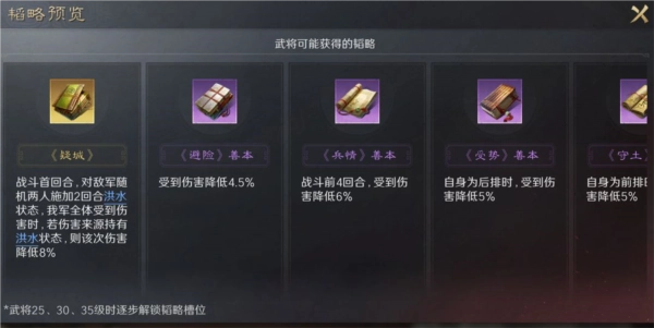 武将在25级、30级、35级时会逐步解锁韬略,橙色武将拥有专属的强力韬略。