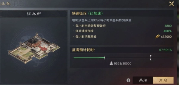 三谋征兵包含三种类型:一是资源征兵,需消耗粮食和时间进行常规征兵,适用于无法使用预备兵或预备兵数量不足的情况;二是普通征兵,每小时会自动征召预备兵,此过程不耗费粮食;三是快速征兵,其征兵速度是普通征兵的4倍,但需要消耗粮食。