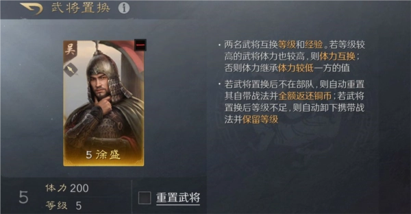 在三谋的新手阶段,玩家能够自由交换任意两名武将的等级和经验值;不过需要注意的是,当等级较低的武将置换为高等级武将后,其体力将会与高等级武将保持一致。