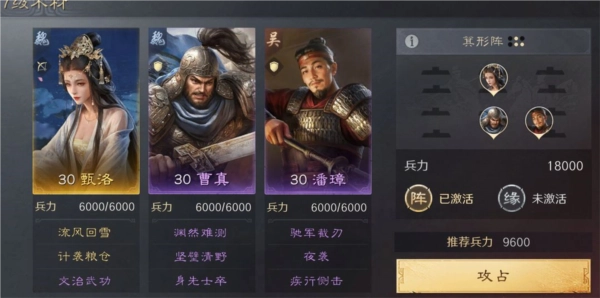 在新手引导阶段,系统会安排我们使用3个初始武将去攻打内城地块。当这3个武将把内城地都打到2级后,建议不要通过置换武将的方式来继承等级,而是直接将这3个武将换下,换上自己准备的开荒队伍,像徐盛、大乔、徐庶这样的组合就可以。
