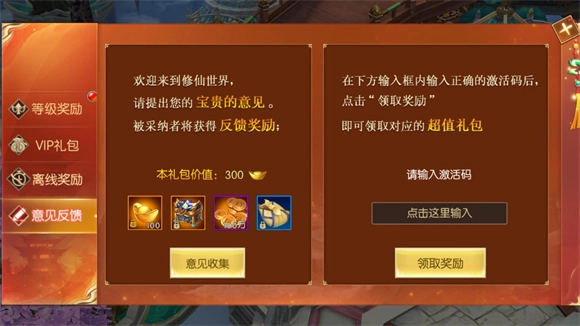 使用方法:先在里面点击福利按钮,接着点击意见反馈,最后把礼包码输入到兑换框里,就能点击领取了。
