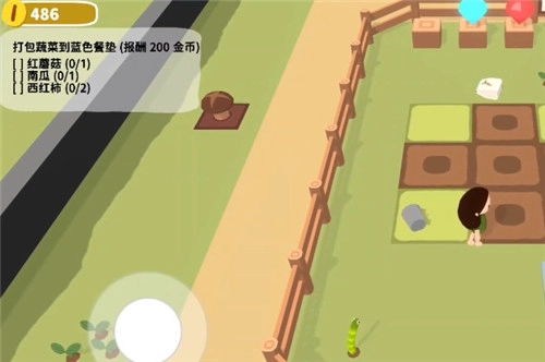 2、就像上图里的任务是把蔬菜打包到蓝色餐垫中,这时候我们只需操控角色去把前面提到的菜都种下去。