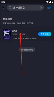 2、接着输入“黑神话:悟空”进行搜索,此时你会发现没有相关的搜索结果,不过你可以选择页面下方的云电脑选项。