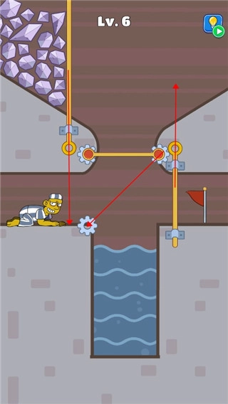 5、第六关,先打开中间的横杆,再放下上面的落石堵住水池,就能顺利通过了。