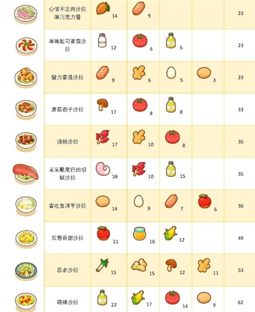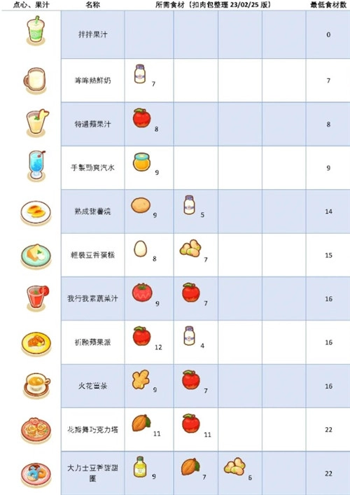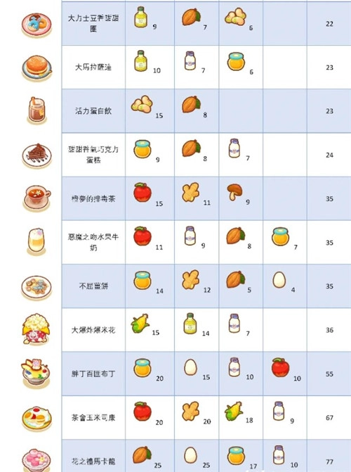 中将从食材基础能量、料理菜谱等方面展开讲解,介绍咖啡、饮料、甜点所需的食材及制作方法,并用图表形式呈现,玩家看图就能了解。