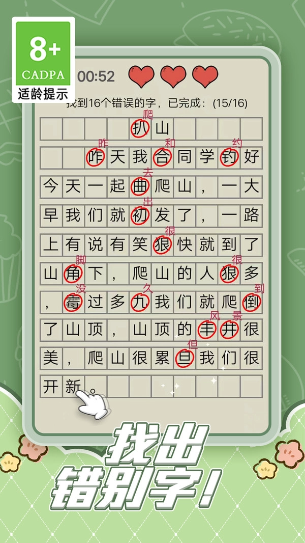 2、充满趣味又极具挑战的汉字解谜游戏,在闲暇无聊的时候不妨试试看,相信你一定能找出所有的错别字!