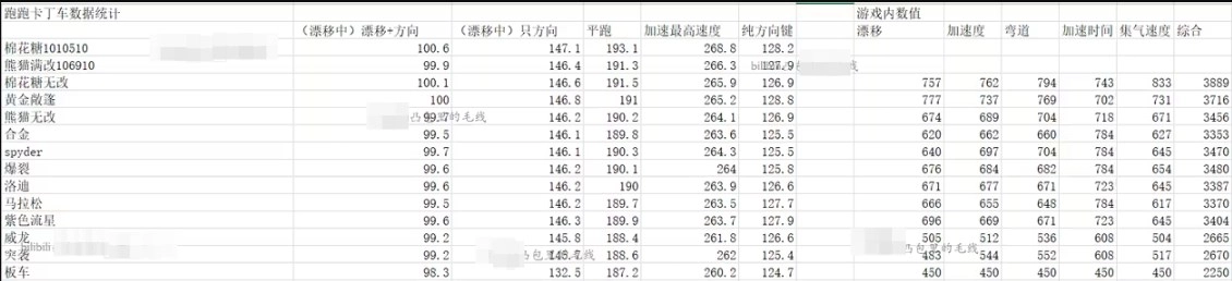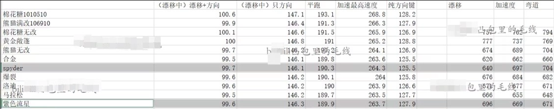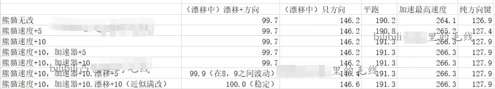 其中,(漂移过程中)漂移+方向是指在漂移时同时按下漂移键与方向键;(漂移过程中)仅方向则是指处于漂移状态下仅按住方向键;平跑速度为无干扰平路行驶时的最高速度;加速最高速度是无干扰平路使用两个加速器能达到的最高速度;纯方向键速度指正常行驶中仅按住一个方向键进行长时间拐弯(非漂移状态)时的速度。