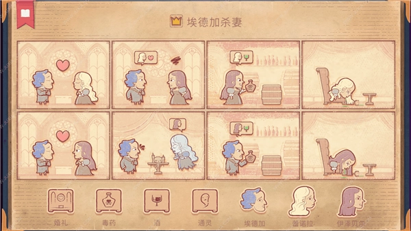 在第八个格子填入“酒+伊泽贝尔”,埃德加便顺利完成了杀妻的行为,主题也随之达成!