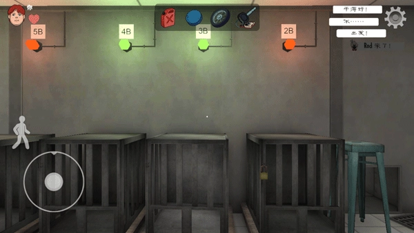 2、玩家需借助地图内的道具逃离此地,点击右侧“手”图标拾取道具,点击左侧人物图标可实现下蹲动作。