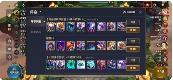 右上角的阵容按钮,既能查看当下的热门推荐阵容,也支持自行提前设置阵容。