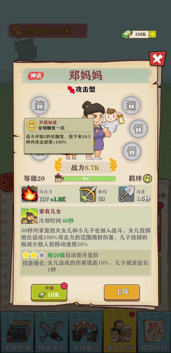 当然,不同角色之间也存在着一种神秘的联结——羁绊。村民们相互配合时,整体实力会得到显著增强。例如,郑妈妈与送水工邓哥组合在一起,就能触发“养家糊口”的效果,大幅缩短技能冷却时间,恰似一人在外奔波赚钱,一人留在家中照料孩子,分工协作,相得益彰。