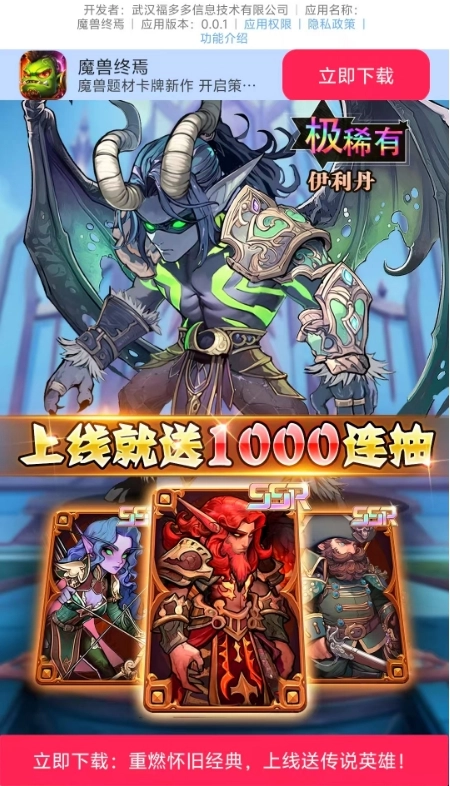 上线即赠1000连抽,超稀有魔兽卡牌英雄待你领取!