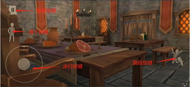 走到餐厅的一侧,拿起那里的紫色布匹,用它来伪装投石机。之后要赶紧躲开左边的士兵,再去把第二段布匹收回来。这些士兵动作很灵活,既能攀爬又能匍匐前进。