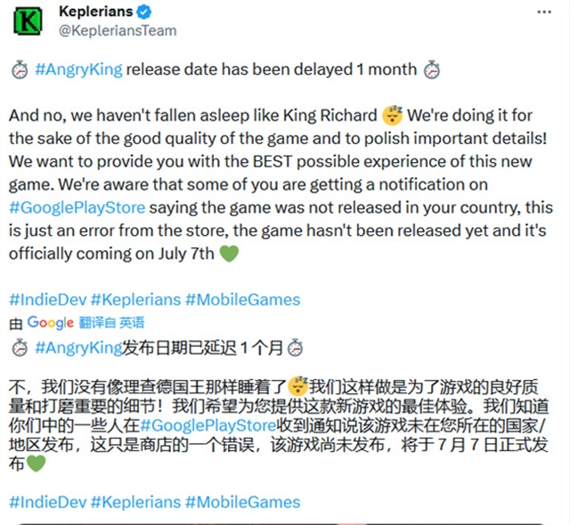 恐怖冰淇淋工作室的新作《愤怒的国王》宣布延期上线。该游戏原计划于6月8日推出,不过工作室近期表示,为了给玩家带来更优质的游玩体验、呈现更出色的游戏质量,同时需要进一步打磨内容细节,因此决定将上线日期推迟至7月7日。请各位玩家耐心等待。