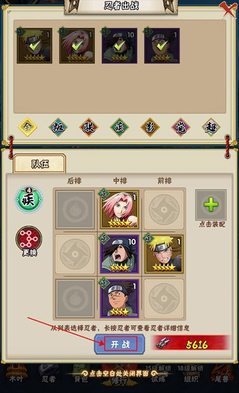 5、当拥有充足的资源和道具后,玩家就能对自己喜爱的忍者角色展开培养,借助穿戴装备、等级提升、星级进阶等方式来增强其战斗能力。