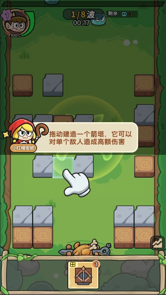 2、准备进入战斗状态,拖动建造一座箭塔,它能够对单个敌人造成较高的伤害。