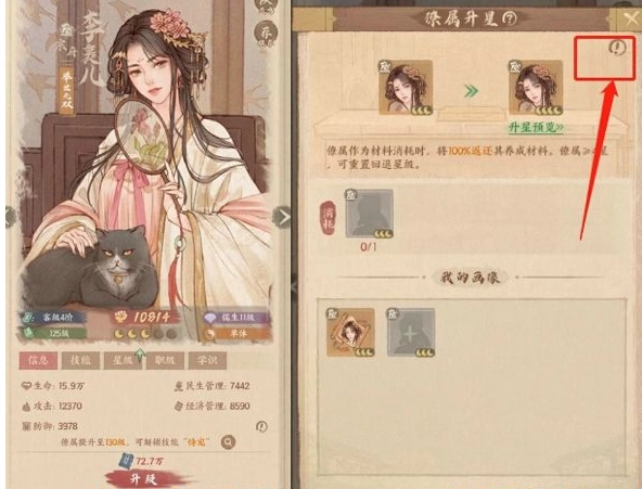 当我们进入僚属界面后,点击升星按钮,接着点击右上角的感叹号【!】,这样就能查看该僚属升级到下一星级所需消耗的资源了。具体操作可参考下图: