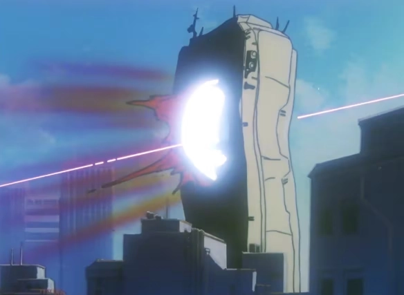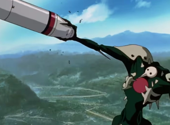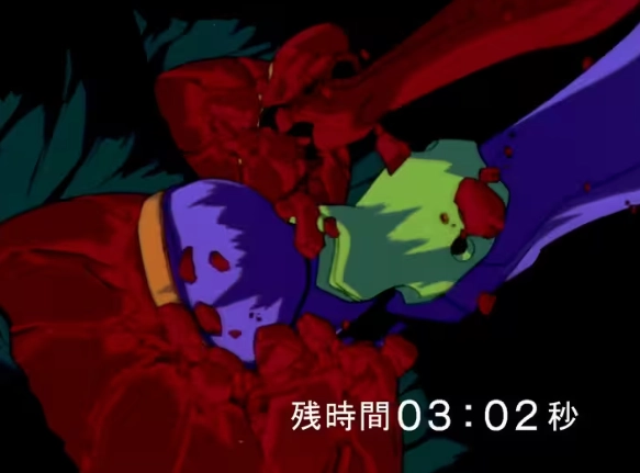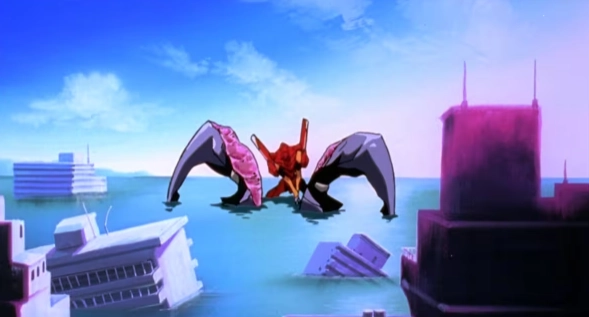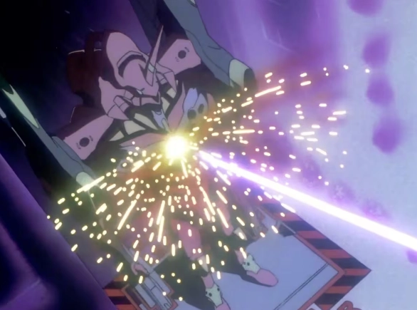 第五使徒的粒子炮攻击将初号机击退,随后使徒用钻机缓缓向下钻探。(这使徒的粒子炮威力确实惊人,可惜智商不太在线——要是直接用粒子炮往下轰几次,估计早就解决问题了,何苦还要费力用钻头呢)