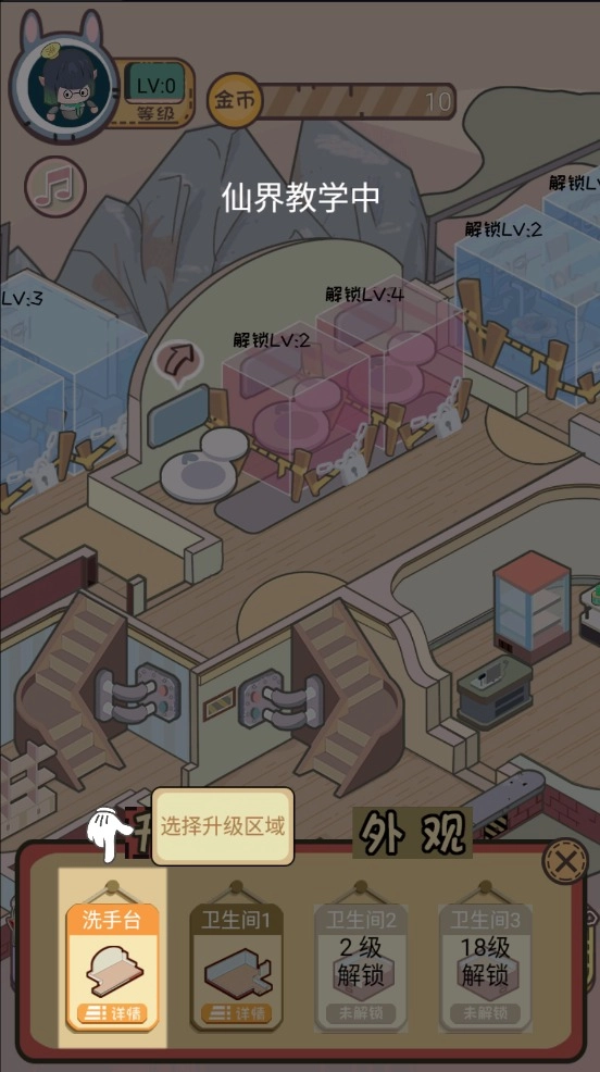 2、按照引导点击建筑,选择要升级的区域进行升级操作,玩家就能解锁新的区域。