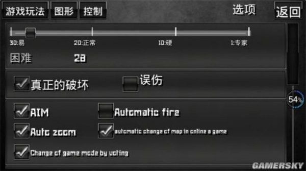 在“玩法”设置里有个“Automaticfire”选项,这就是自动开火功能,把这个选项前面的√取消掉,就像上面这张图显示的那样。