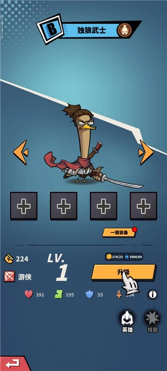 9、点击【升级】按钮,若当前拥有可穿戴的装备,为英雄穿上后,能增强其战斗实力。