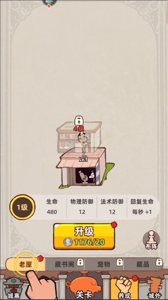 1、在城寨里点击老屋,就能进入老屋的建设界面。消耗银币可以给老屋升级,升级后的老屋能提供更丰厚的属性加成;当老屋等级达到特定要求时,则需要使用指定的砖头道具来完成突破。