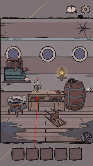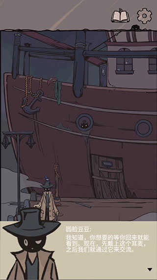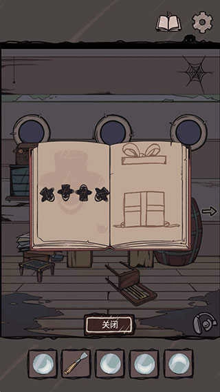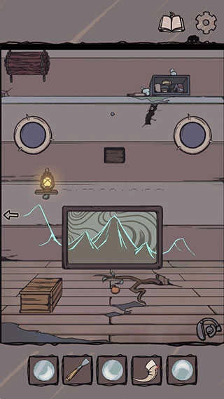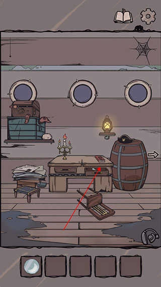 9.画像旁的墙壁上有个一号角的涂鸦,把它贴到本子上的问号位置,然后按行李箱、船票、船、号角的顺序依次点击,翻页到礼物盒后,点击礼物盒就能找到最后一枚月亮便士。