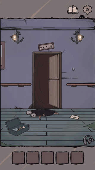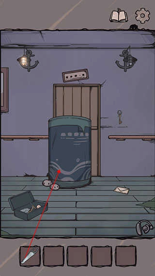 2.目前唯一的入口是船舱的小门,那把锁已被海水锈蚀,我们只需捡起地上的铁棍,就能将锁撬开。
