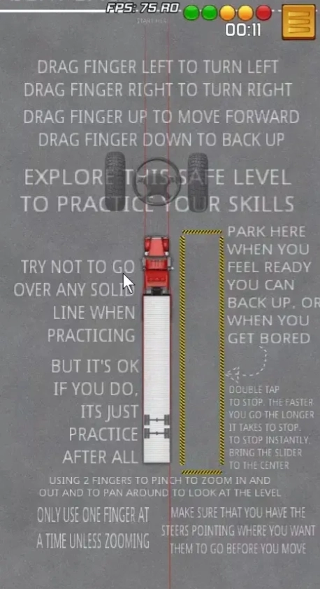 我的卡车练习模拟器里,剩下的屏幕是用来控制速度的。你可以在屏幕上方75%的任意区域,通过向上或向下滑动手指来让卡车前进或后退。要是想让卡车停下,只需要在屏幕任意位置双击一下就行,系统会发出停止的提示音。