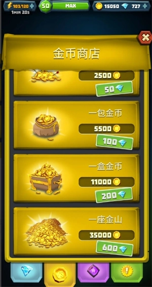 砖石的使用方法:先收集砖石,直到数量达到600,然后前往商店,用这600砖石兑换金币(也就是那堆金山),兑换来的金币可以用于骰子的升级。