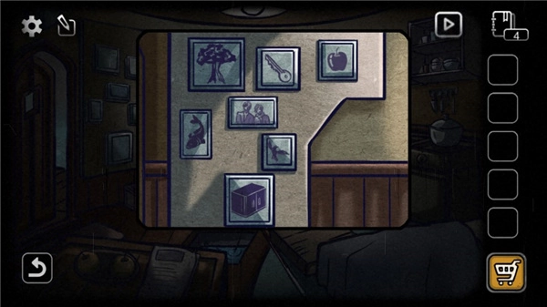 请记好图标的排列顺序,然后返回房间。接着点击电视左侧的照片墙。(树、鸟、柜子、人)