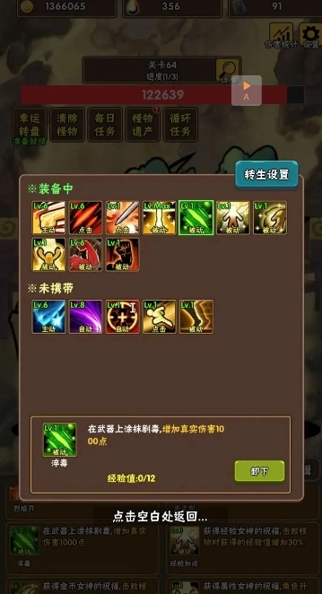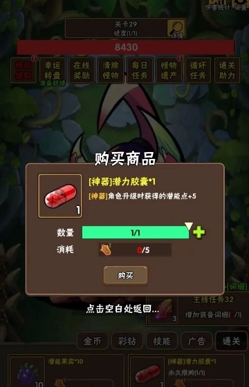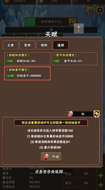 如图所示,先把所有的初始金币加点都点满,接着去商城购买经验。至少要点到42级之后,再继续点经验加成。要优先把初始金币和经验加成这两项都拉满。