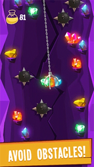 2、在游戏里我们得操控钩爪到地底去抓取宝石和水晶,不过钻石堆里藏着炸弹,一旦碰到就会让你损失一颗宝石,可得小心点哦;