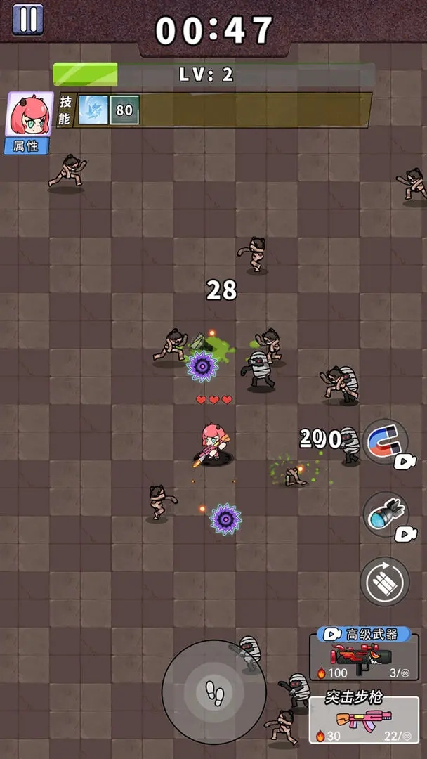 死亡时等级停在21级,已经玩了整整25分钟。越往后升级速度越慢,加上怪物分布稀疏,升级就更费劲了——我连看广告用磁铁的念头都没起,就那点可怜的技能点,一级都升不动,换别的时候用磁铁好歹还能一口气升三级呢。