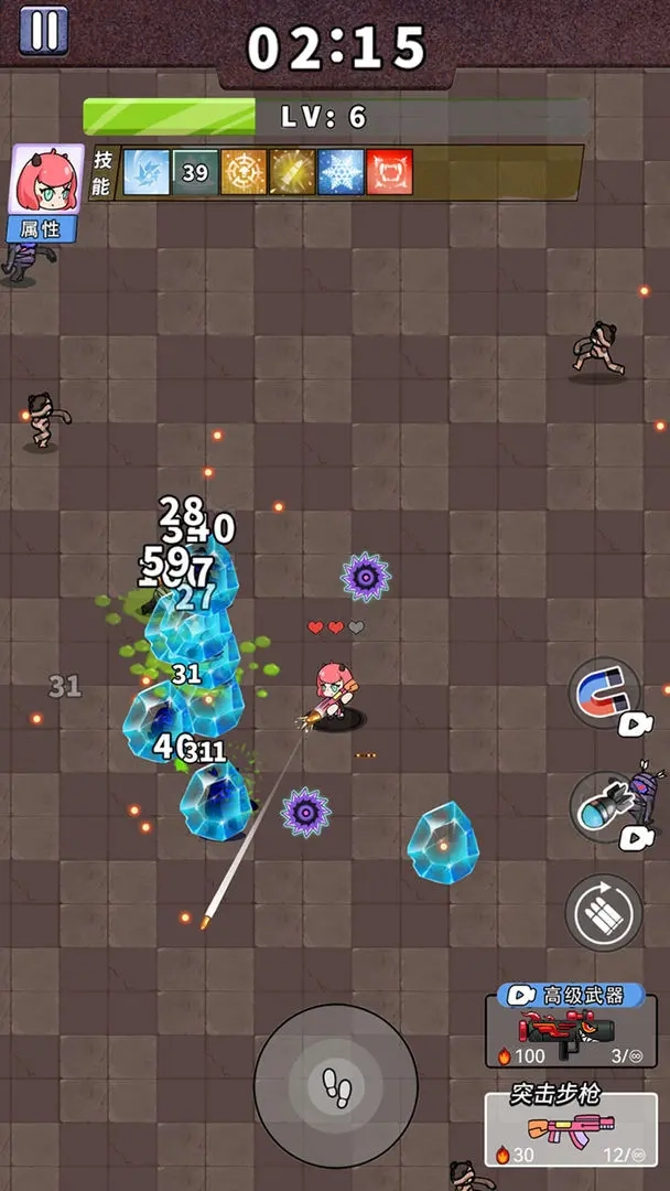 不过后续角色和武器得在机制层面做出区分啊,可实际只有“血量”这一点不同——而且这差异还挺关键,毕竟被攻击一次就直接掉1血,初始3血的角色实在是既脆弱又难操作;武器的核心区别其实就是四维数值上的差异,要是单看获取难度的话,加特林绝对是首选——看两次广告就能拿到手。