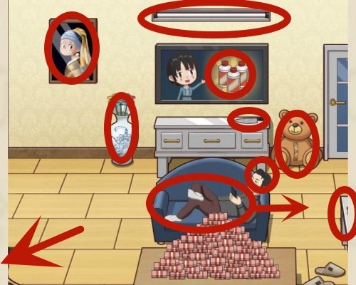 8、向右滑动沙发,把刀拖到地板裂缝处撬开地板,然后将钱拖到暗格处,重复三次这个动作。