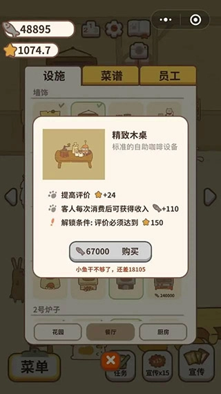 4、建议尽量购买菜品,因为部分动物需要在玩家解锁特定菜品后才会出现。解锁菜品的过程其实也是解锁新动物的过程,这样还能完成相关成就。