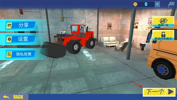 1、进入应用后完成初始设置,点击“下一步”进入模式选择界面,先从已解锁的叉车模式入手,体验基础玩法。