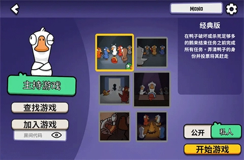 鹅鸭杀国际服(goosegooseduck)是一款以狼人杀为题材的在线多人竞技游戏。在游戏里,每个玩家都拥有独一无二的专属身份。你需要在广阔的太空站地图中穿梭移动,通过完成地图上的任务来推动己方阵营的进度。与此同时,还要仔细观察其他玩家的行为举止,收集散落在各处的道具和线索,或者借助场景中的机制来达成目标。