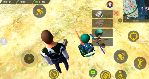 1、通过点击左侧按钮操控角色移动,落地后优先收集战场资源,迅速强化自身装备,为后续战斗筑牢根基。