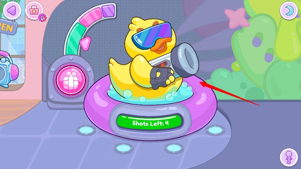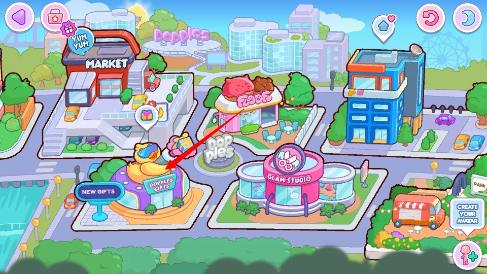 2、按照红框箭头所指的提示,点击紫色建筑顶部的新礼物图标。